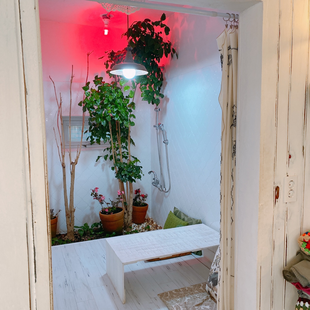 내부를 들여다보면 어느 방이 안방이고 어느방이 욕실이었는지 추측하는 재미를 느끼게 해 줍니다. 욕실로 추정되는 방 한 칸에 샤워기기와 수도꼭지가 그대로 놓여있습니다. 가지런히 놓인 샤워기기들은 사람의 위생을 유지시켜주는 역할에서 식물들의 생명을 책임지는 역할로 직업을 이직했습니다.