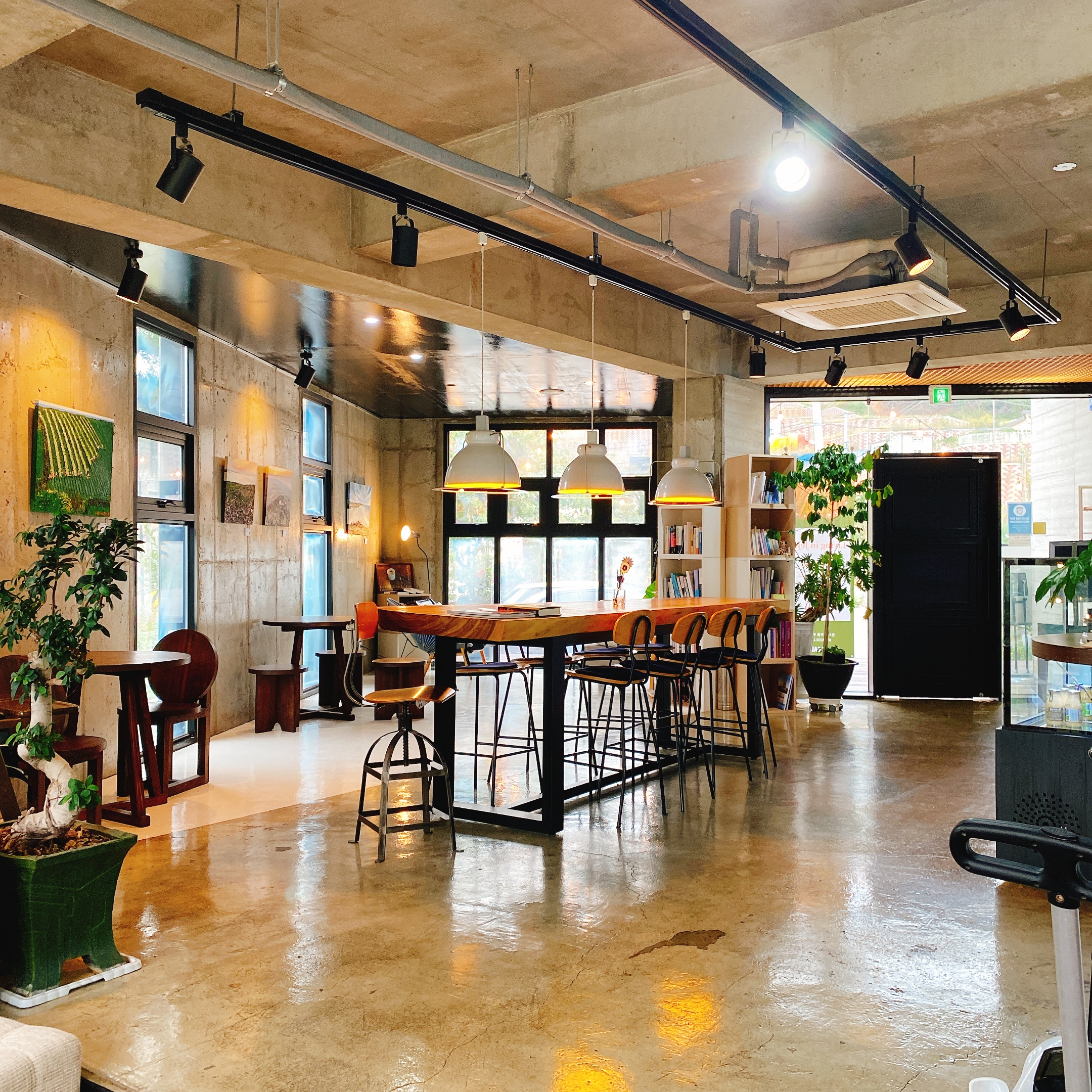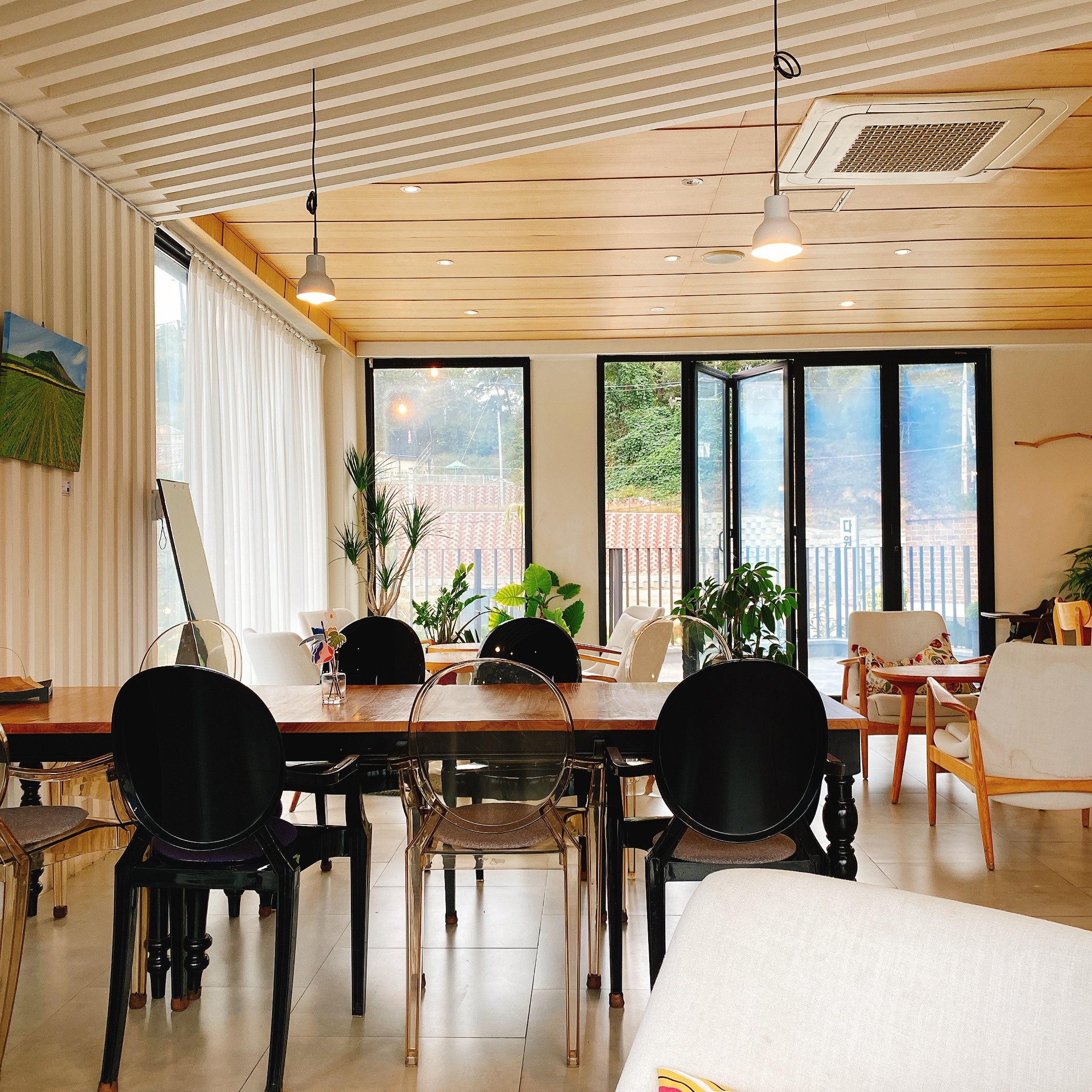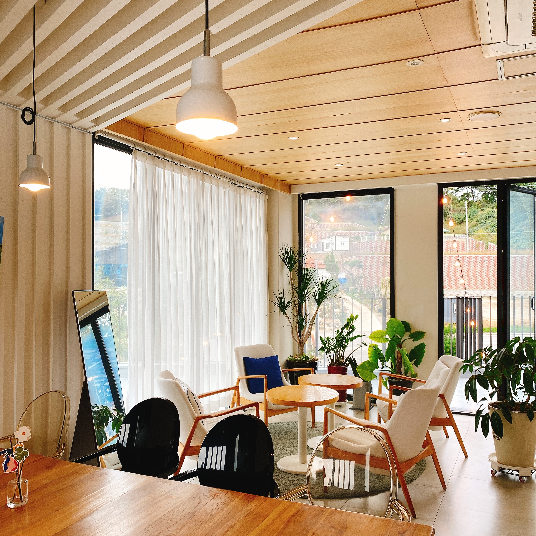 카페 1층의 내부 모습입니다. 테이블과 의자 그리고 조명들이 동일한 디자인을 갖추지는 않았지만 따뜻하고 깔끔한 분위기에 잘 어우러지게끔 배치되어 있습니다.