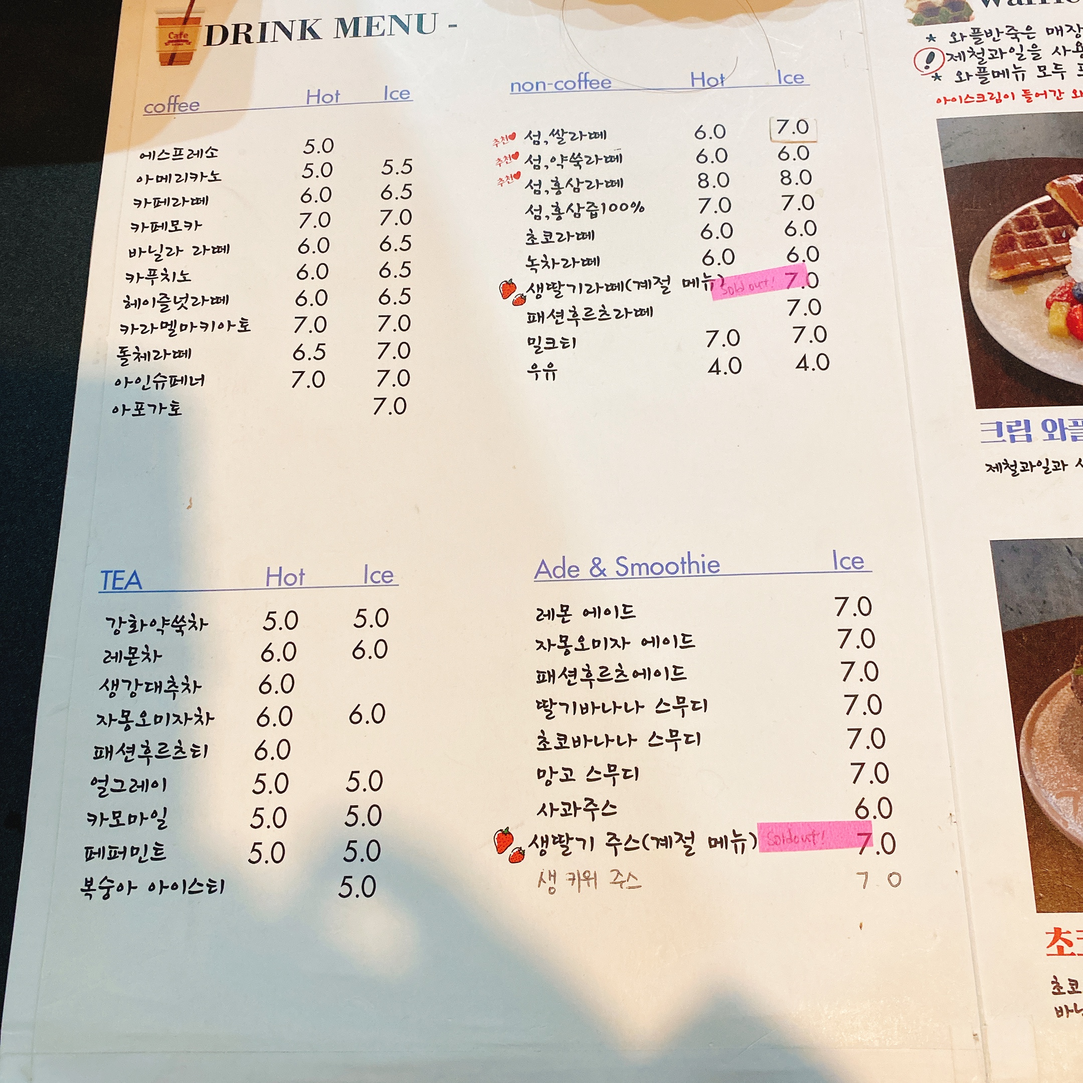 섬아이는 생과일 와플메뉴와 강화도 특산물을 이용한 드링크메뉴들이 이곳의 시그니처 메뉴들이에요.