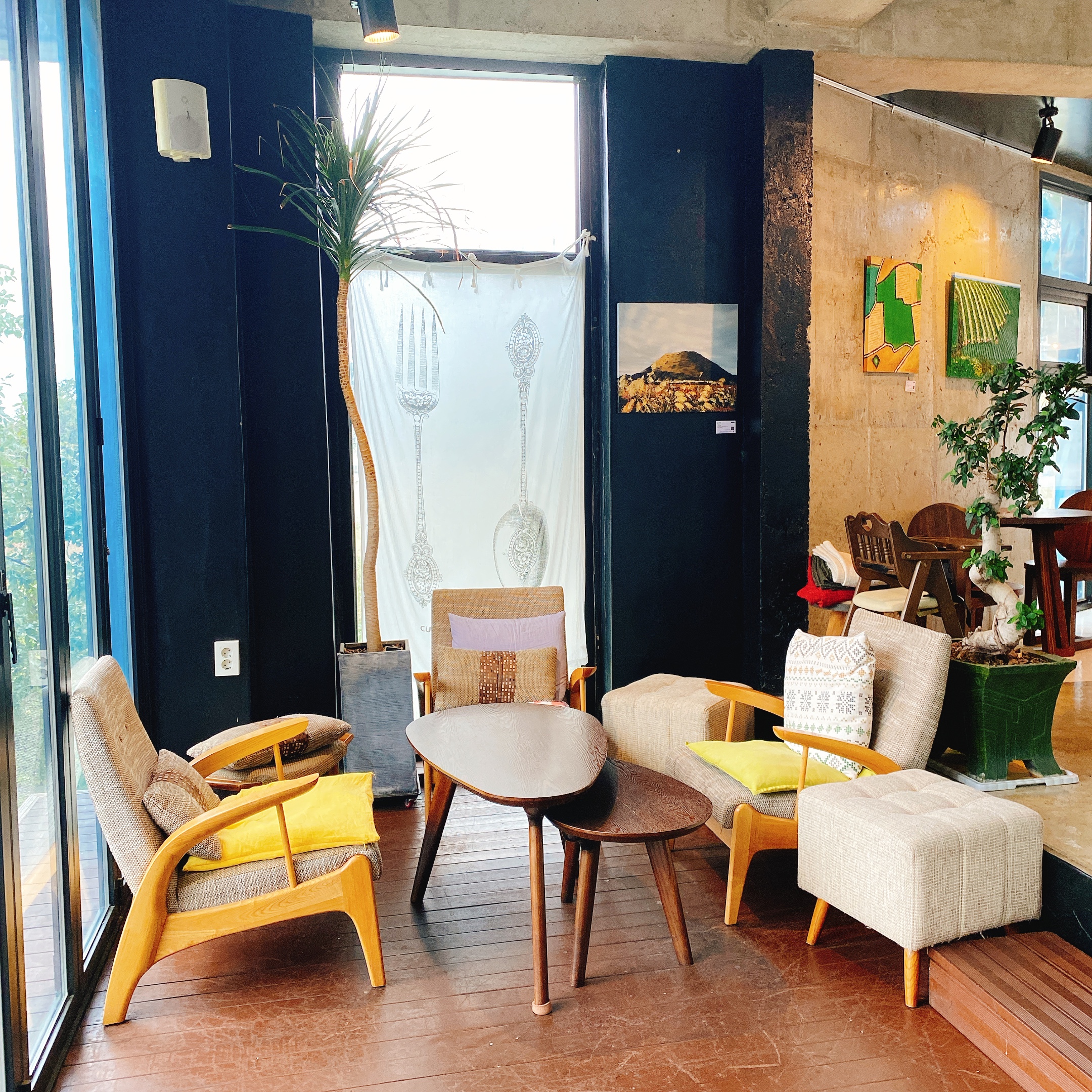 카페 곳곳에 송용한 작가의 작품들이 전시되어있습니다. 제주도에 대한 아름다운 풍경들이 인상적이었습니다.