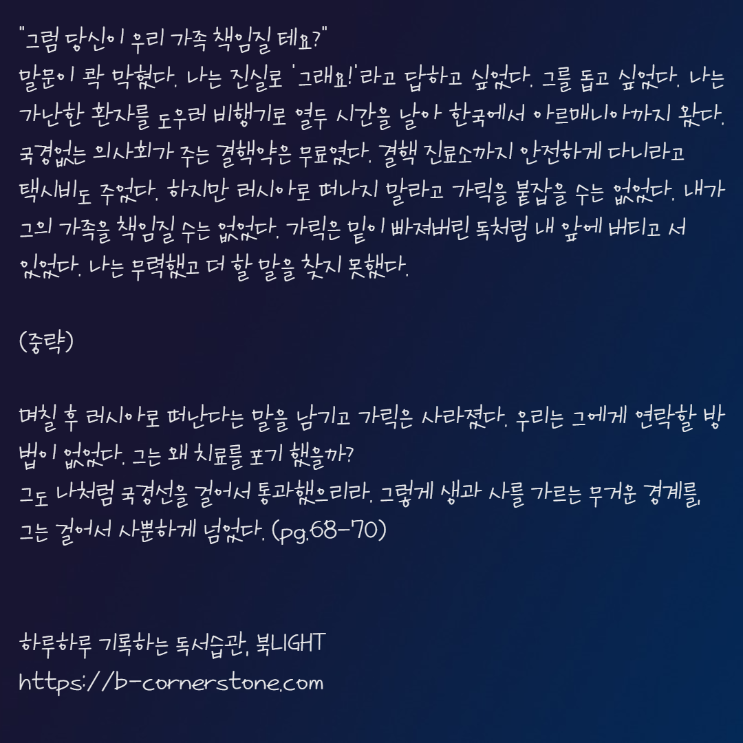 운명에 이끌리듯 국경없는의사회에 가입하여 아르메니아로 긴급구호활동을 떠났습니다. 죽음을 동경하는 건강한 신체를 가진 의사는 하루라도 더 살고 싶어 하는 환자들을 만나게 되었고 저마다의 사연을 가지고 있는 그의 동료들을 만났습니다. 죽음의 경계에 놓인 상황 속에서 의사는 숨을 쉬고 살 수 있었습니다. 그는 삶의 의지를 찾고자 자신의 몸을 점점 죽음의 경계로 몰아붙였습니다.