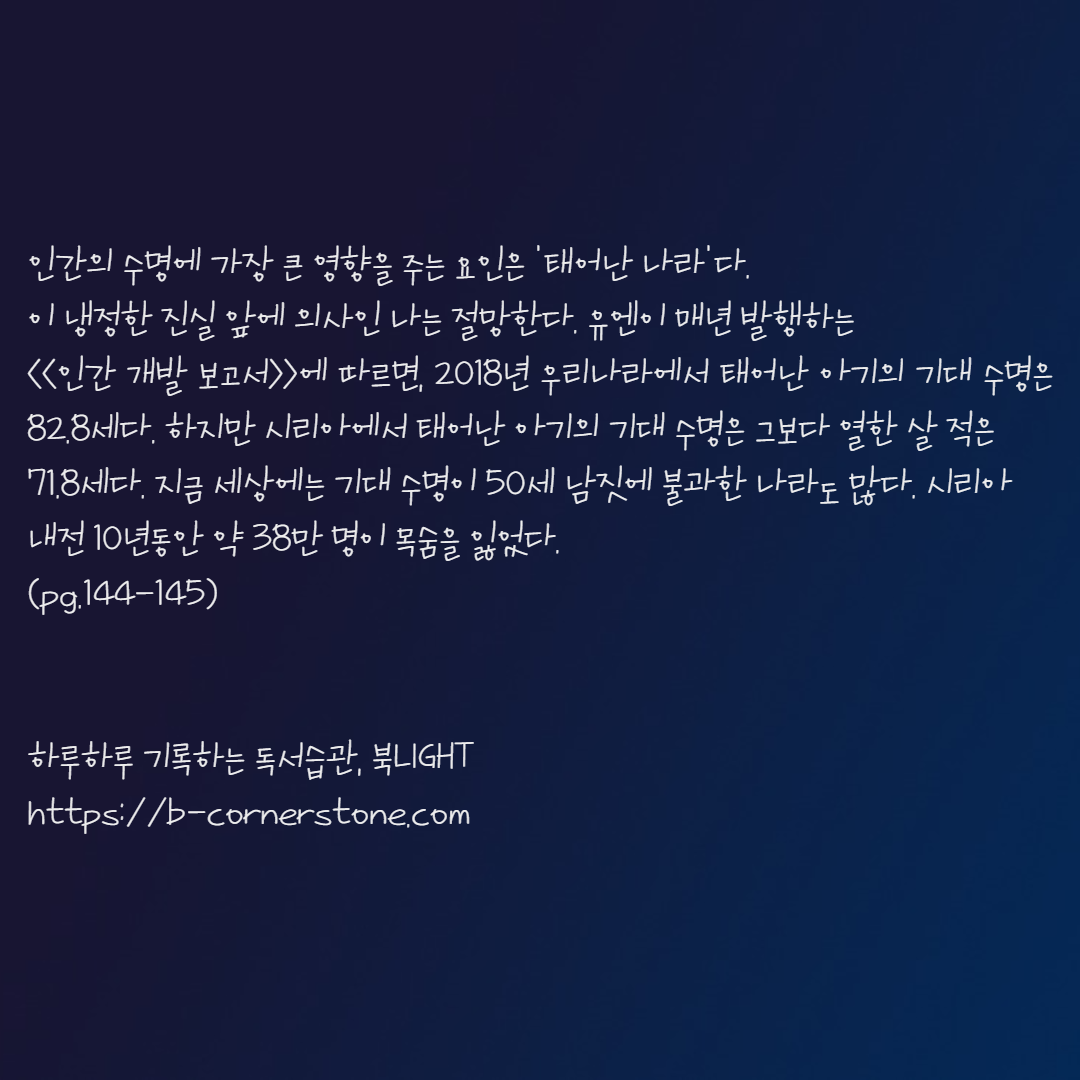 서울대학교 의과대학을 졸업하고 의료관리학 교실 전공의로 재직한 이 남자. 남들이 보기에는 탄탄대로의 인생을 걷고 있을 것만 같고 남부러울 것 없는 인생을 살고 있을 것만 같던 이 남자에게 불현듯 우울증이라는 병이 찾아왔습니다. 2년간의 시간 동안 아침마다 영어학원을 다니는 등 홀로 고군분투를 하여 증상을 회복했지만 그의 마음속에는 삶의 의미라는 질문이 떠나질 않았습니다.