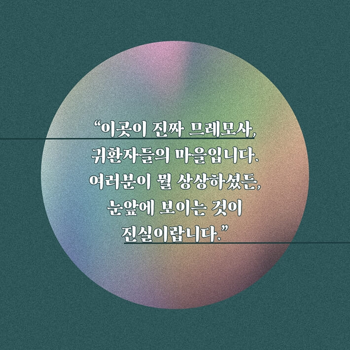 죽은 땅 위에 건설된 귀환자들의 마을. 그것이 므레모사에 그림자처럼 따라붙는 이 도시의 닉네임이었다. 므레모사가 처음부터 생명력을 잃어버린 땅은 아니었다. 므레모사는 유독성 화학물질의 유출로부터 비극은 시작되었다. 죽어버린 땅이라고 사람들은 말했지만 정작 이곳에서 정착하며 살았던 사람들은 마을로 다시 돌아왔다. 사람들은 이들을 귀환자라고 불렀다. 폐허가 되어버린 도시에 다시 돌아오게 된 이유를 알고 싶어 하면서도 사람들은 정작 귀환자들이 무슨 이야기를 하고 싶어 하는지는 알고 싶어 하지 않았다. 진실이야 어찌 됐든 돌아온 귀환자들이 한없이 안타깝고 그저 구출해내고 싶은 마음뿐이었다.