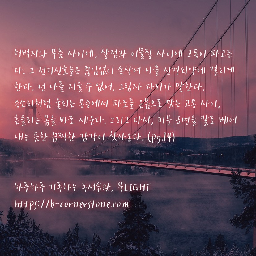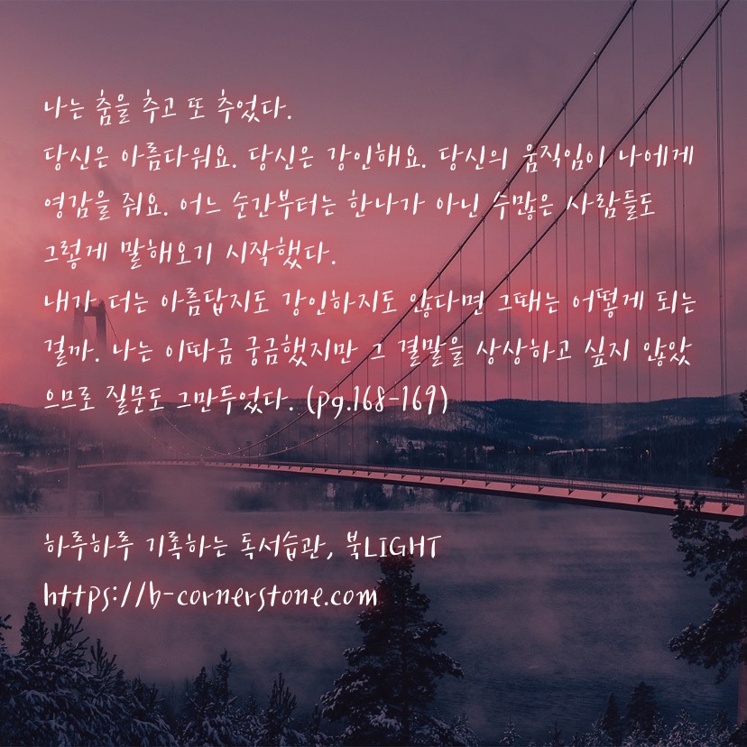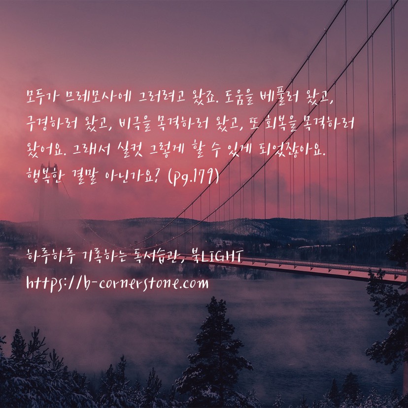 디스토피아 하면 김초엽, 김초엽 하면 자연스럽게 떠오르는 연관검색어 중 하나가 바로 디스토피아라는 단어이다. 지구 끝의 온실과 방금 떠나 온세계 그리고 우리가 빛의 속도로 갈 수 없다면까지 접하며 대중들에게 디스토피아라는 단어는 더 이상 낯설지 않은 단어가 되어버렸다. 많은 북리뷰어들이 디스토피아와 므레모사에 일어난 재난과 공포에 대해 글을 썼지만, 필자는 유독 이 책의 주인공인 유안이 신경쓰였다. 고통과 비명사이에서 춤을추는 상상을 하고 사랑하는 연인 한나에게 멈춰달라 애원하지만 박수와 갈채 그리고 사람들의 환호속에서 무대가 끝나버리는 허탈한 상황을 그리고 그녀의 마음을 알아주기를 바라는 사람은 아무도 없었다.