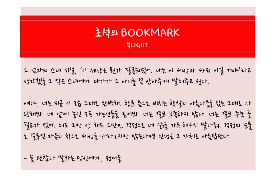 엄마라는 존재는 그저 나 보다 어른이며 내가 살아온 발자취보다 더 오래된 발자취를 만드는 존재라는 생각을 가지고 있었던 필자와 세상을 향해 원망만을 가득 채웠던 어린 시절 엄마에게 안아주며 따뜻한 위로를 전한다는 시선을 가진 정여울 작가, 그녀만의 프레임은 필자에게 실로 신선한 충격을 가져다주었습니다. 이 글은 이 세상의 모든 엄마들뿐만 아니라 이 지구 속 힘든 역경을 딛고 있는 사람들에게도 큰 울림을 주는 글이기도 합니다. 마치 정여울 작가가 나에게 다가와 안아주며 해주는 말처럼 말이죠.