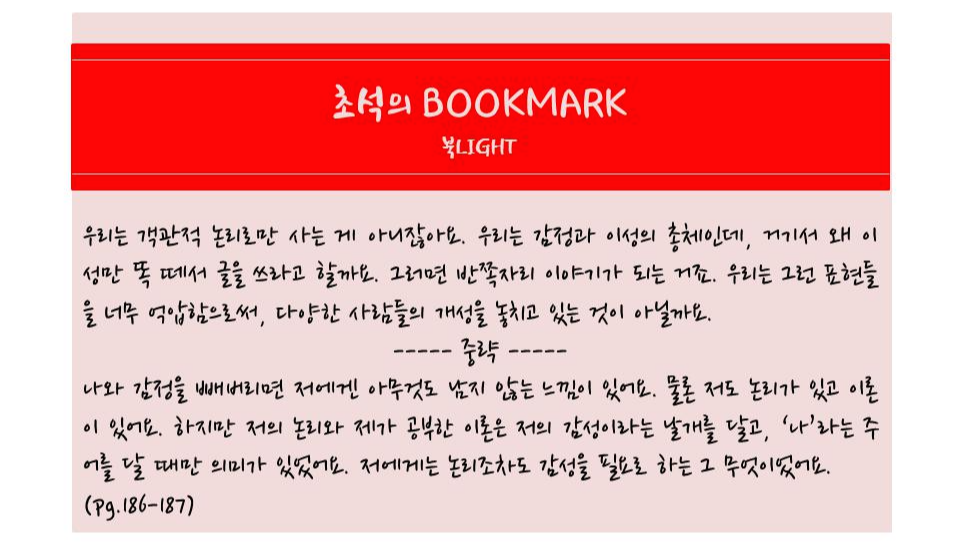 작가가 대학원 논문을 작성할 당시 많은 교수들로부터 감성을 지워야 한다는 지적에 방황하게 되었고 논문 쓰기가 싫어졌다고 말했는데 호소력이 짙은 필력을 가진 베스트셀러 작가일지라도 논문에 감수성을 담고자 하려는 의도가 보였다는 것에 필자의 머릿속엔 물음표가 여러 개 그려졌습니다.