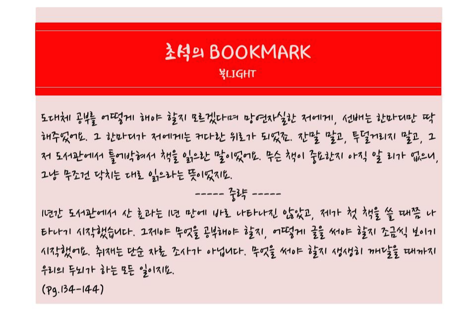 1년 동안 여러 가지 도서들을 섭렵하며 도서관에서 살다시피 한다면 구체적으로 구성되어 있고 여러 사람들의 손을 거친 검증된 많은 자료들을 섭렵할 수 있고 보석 같은 문장들을 발견할 수 있다는 것입니다. 그 과정에서 나의 자산과도 같은 자료들이 머릿속에 누적이 되고 이를 이용하여 재창조를 할 수 있게 되는 것이죠.