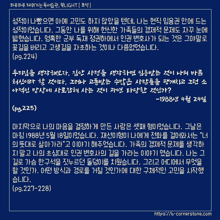 소년공은 학교도 고시합격도 힘겹게 들어갔고 수행했습니다. 교복조차 입을 수 없었던 환경에서 학원을 다니며 검정고시로 고등학교 학력을 얻었고 짧은 시간안에 얻은 정보는 대학교 수업을 따라가기에도 급급했습니다. 그리고 자신의 일기장에 고민을 털어놓을 수도 없었을 만큼 고시공부에 전념하여 현직임용권에 드는 성적으로 사법고시에 합격했습니다. 현직임용권에 들어 판사가 되면 탄탄대로였을텐데 그의 마음은 개인의 이익과는 거리가 멀었습니다.