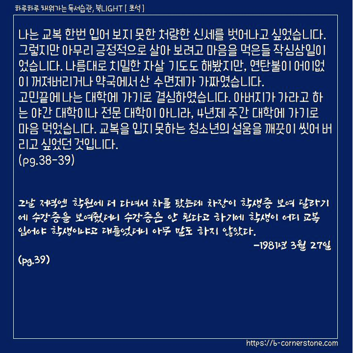 소년공에게 일기장이란 무엇일까요? 그에게는 많은 사람들이 있었지만 아무도 없었습니다. 함께 일하는 동료들도 그리고 가족들도 그의 마음을 보듬어 주는 사람하나 없이 그는 외로운 시절을 보냈습니다. 아마도 가난했던 삶보다는 그 점이 그를 더욱 힘들게 했을 것입니다. 자존심 강한 성격탓에 그는 누군가에게 마음을 열려는 시도조차 하지 않았습니다. 그저 말없이 묵묵하게 들어주기만 하는 한낱 종이장들이 그에게는 오랜 친구이자 삶을 지탱해주는 수단이었을 것입니다.