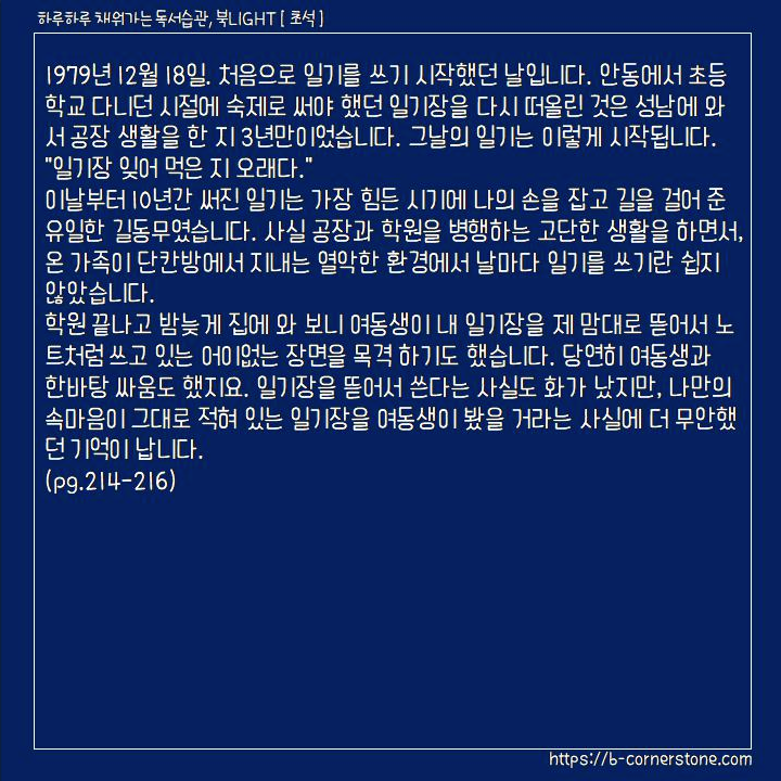 소년공에게 일기장이란 무엇일까요? 그에게는 많은 사람들이 있었지만 아무도 없었습니다. 함께 일하는 동료들도 그리고 가족들도 그의 마음을 보듬어 주는 사람하나 없이 그는 외로운 시절을 보냈습니다. 아마도 가난했던 삶보다는 그 점이 그를 더욱 힘들게 했을 것입니다. 자존심 강한 성격탓에 그는 누군가에게 마음을 열려는 시도조차 하지 않았습니다. 그저 말없이 묵묵하게 들어주기만 하는 한낱 종이장들이 그에게는 오랜 친구이자 삶을 지탱해주는 수단이었을 것입니다.