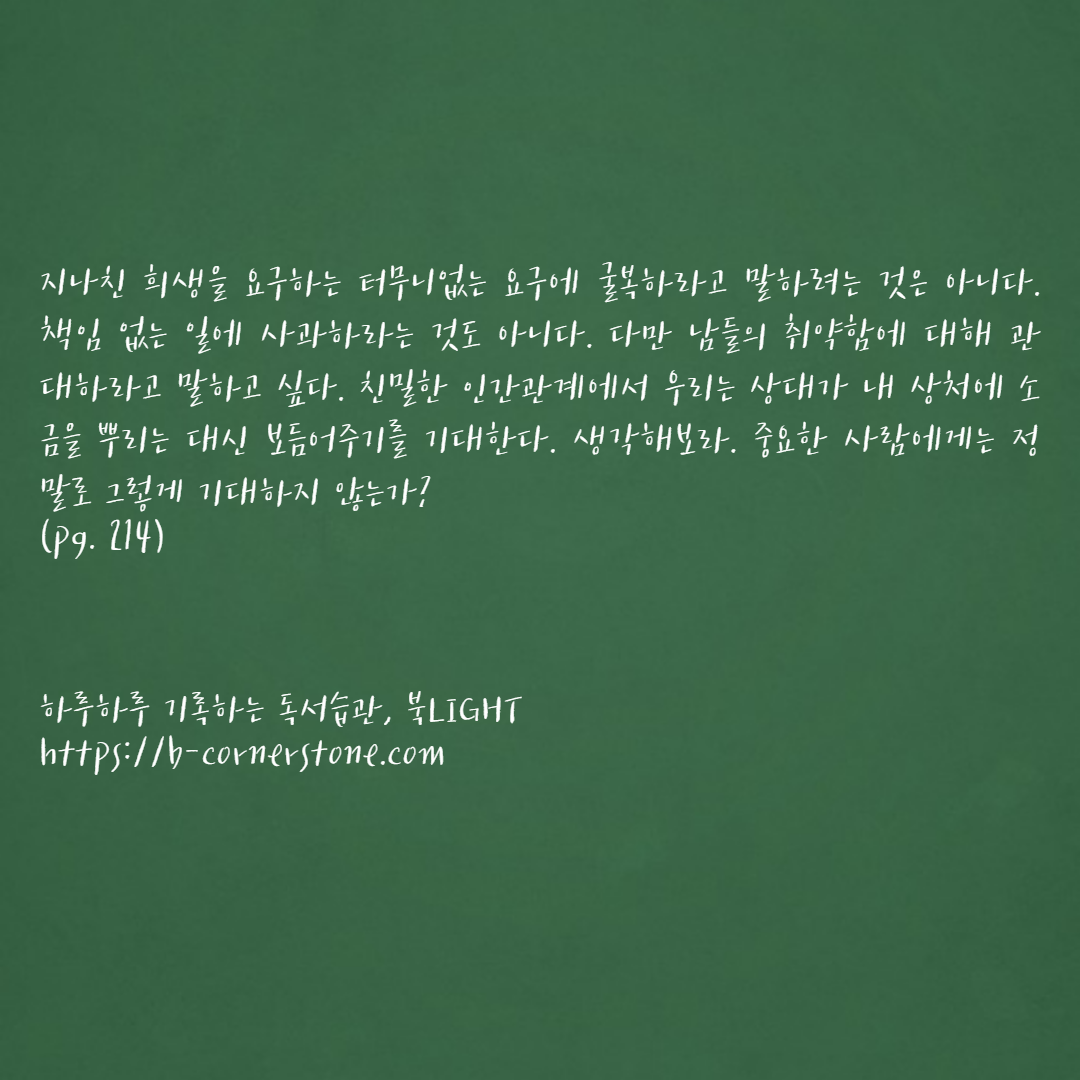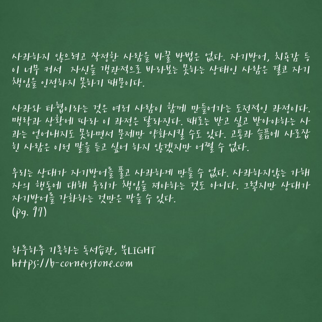 계기가 그러하다 보니 피해자의 입장에 대해서만 나열했다. 누군가에 대한 분노가 쌓였던 시기에 필자의 입장과 처지가 맞물려 리뷰 또한 주관적인 입장에 초점이 맞춰진 것은 아닐까 염려가 된다. 책의 내용은 필자의 리뷰가 전부는 아니라는 것만 알아주었으면 좋겠다. 도서 내용의 대다수는 가해자가 피해자에게 사과를 하고자 할 때의 조심해야 할 말과 해야 할 말들로 구성되어있다는 것을 명심하라.