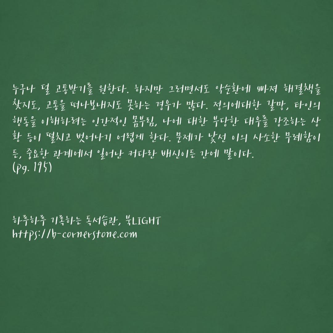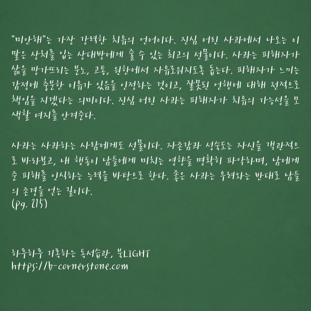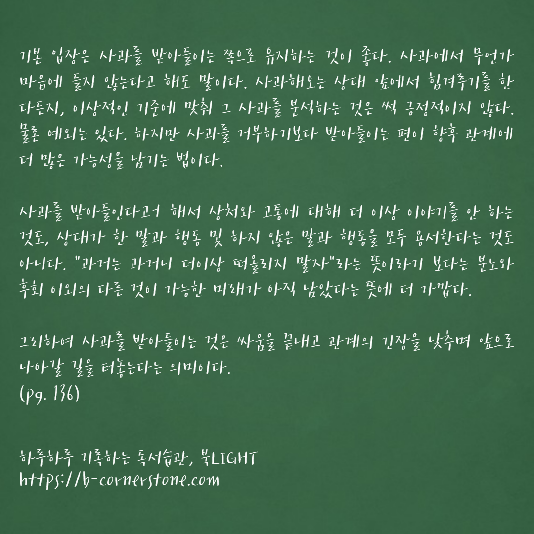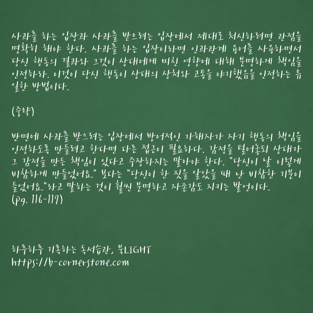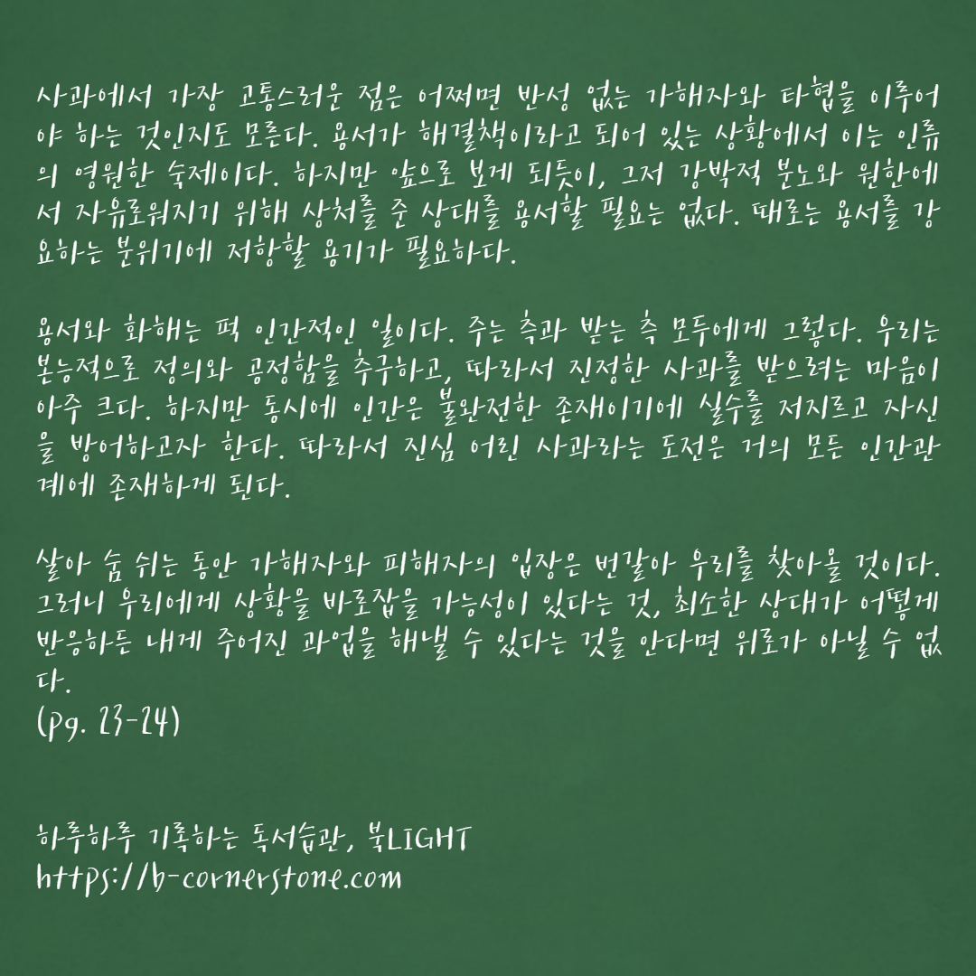 계기가 그러하다 보니 피해자의 입장에 대해서만 나열했다. 누군가에 대한 분노가 쌓였던 시기에 필자의 입장과 처지가 맞물려 리뷰 또한 주관적인 입장에 초점이 맞춰진 것은 아닐까 염려가 된다. 책의 내용은 필자의 리뷰가 전부는 아니라는 것만 알아주었으면 좋겠다. 도서 내용의 대다수는 가해자가 피해자에게 사과를 하고자 할 때의 조심해야 할 말과 해야 할 말들로 구성되어있다는 것을 명심하라.
