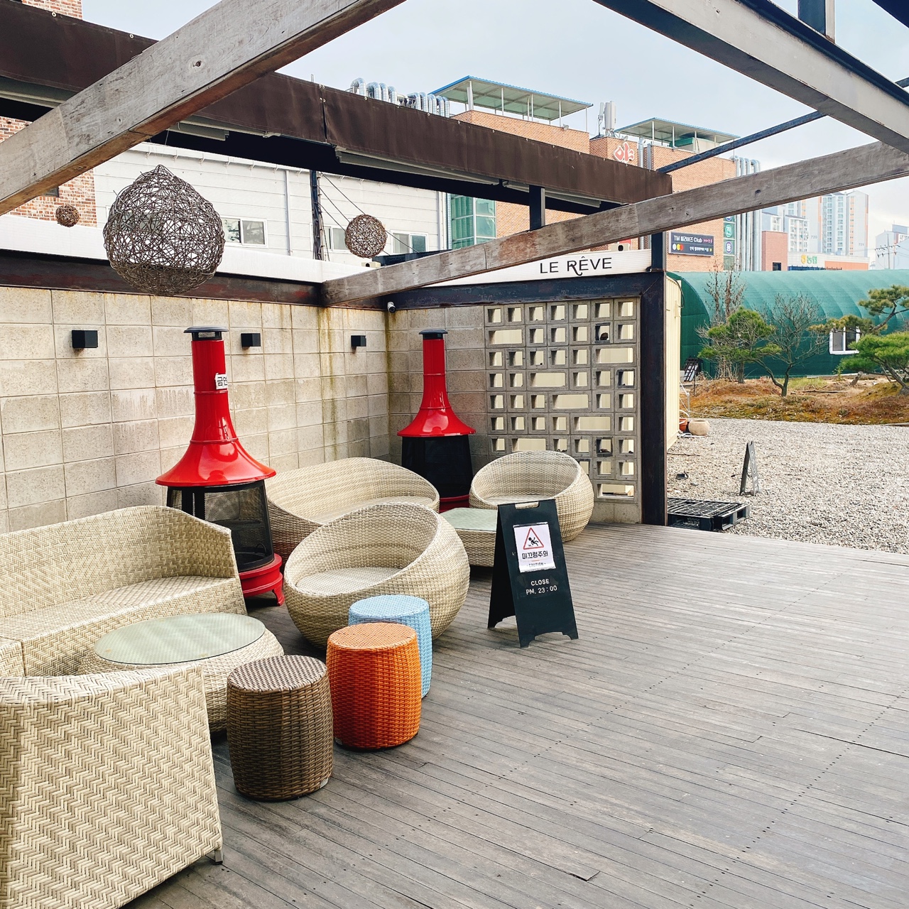 동탄 르레브 카페는 모든 사람들을 수용할 수 있는 1층과 노키즈존인 2층 그리고 야외 테라스가 있습니다. 2층의 노키즈존은 위치상 아이들의 안전성을 우려함이 주된 이유라고 합니다. 보통 야외 테라스는 추운날씨에는 이용하기란 부담스럽습니다. 하지만 동탄 르레브 카페는 이동식 난방히터를 설치했으며 야외에 간이 건물을 설치해서 추운 겨울에도 따뜻하게 테라스를 이용할 수 있는 공간을 마련하였습니다.