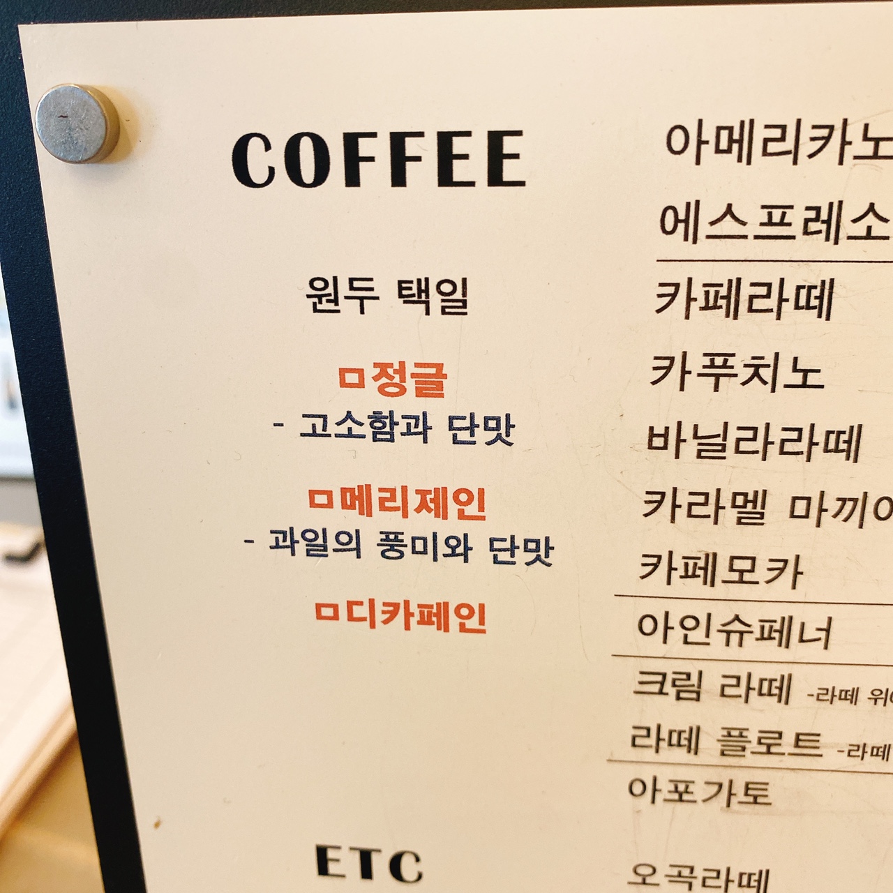 커피뿐만 아니라 베이커리에 쓰인 재료들도 투명하게 공개되어 방문객들의 건강까지 섬세하게 고려한 카페 주인분의 노고가 선명하게 잘 드러나 있습니다. 방부제와 합성착향료 그리고 인공색소까지 넣지 않았다고 하니 아이들도 안심하고 건강하게 먹일 수 있을 것 같습니다.