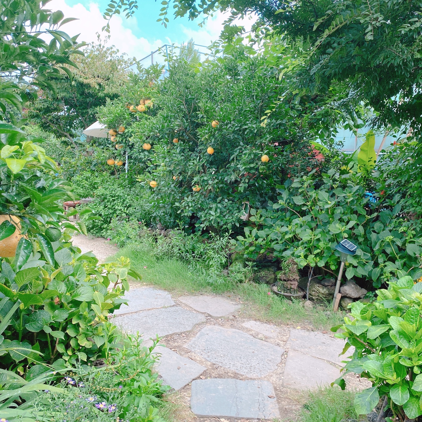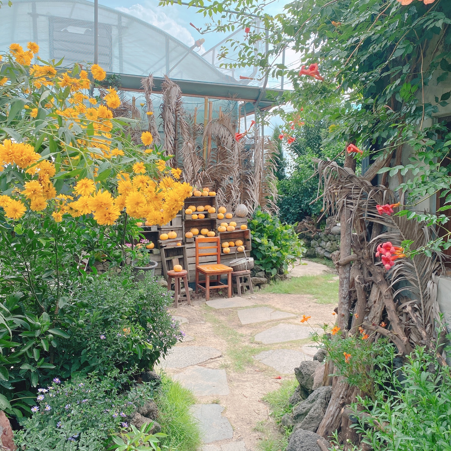 제주 서귀포 귤꽃다락 카페 이전 용도가 귤밭돌창고인 만큼 건축물 주변에는 귤나무들로 가득합니다. 한여름에 방문했던 터라 푸른빛을 띄는 영귤로만 가득하여 상상했던 주황빛 귤들을 배경삼아 인생샷을 남기진 못했지만 한여름의 귤밭의 또다른 매력을 느낄 수 있었습니다.