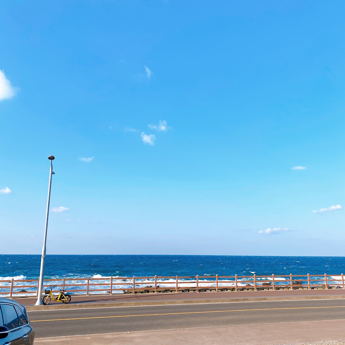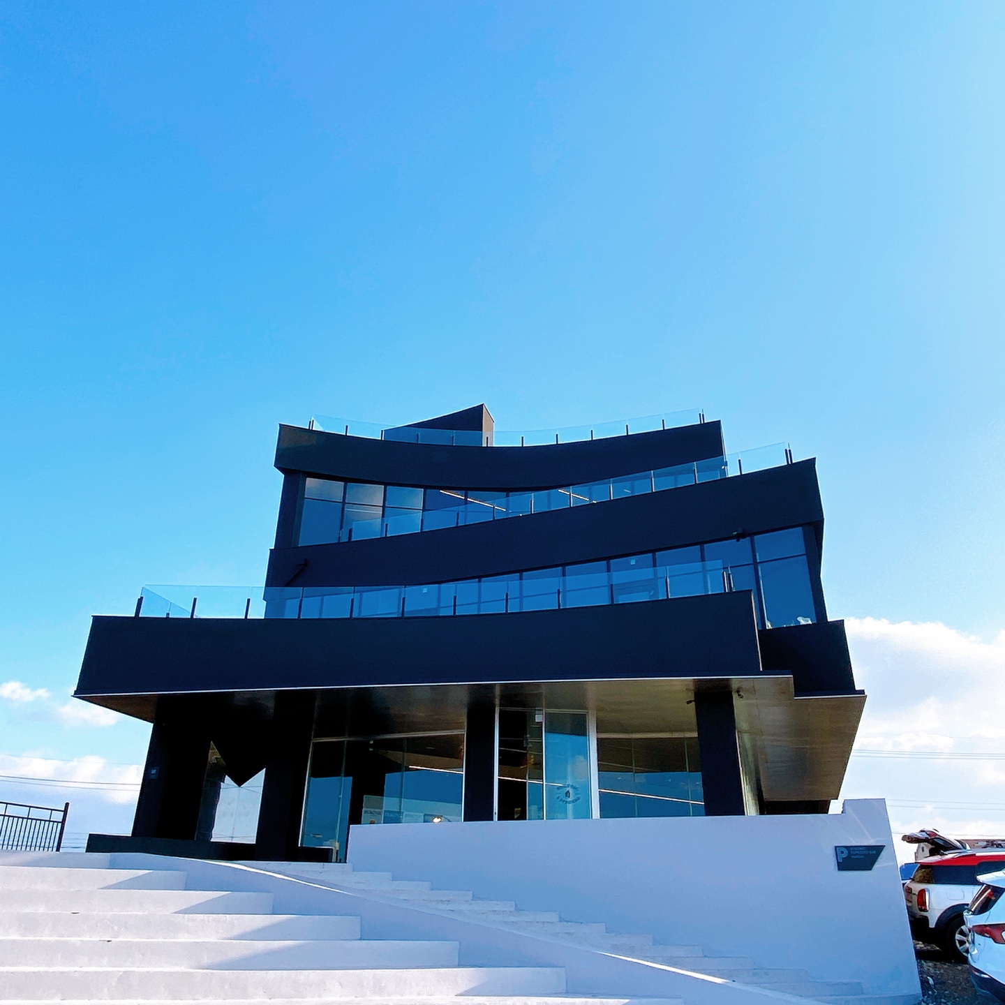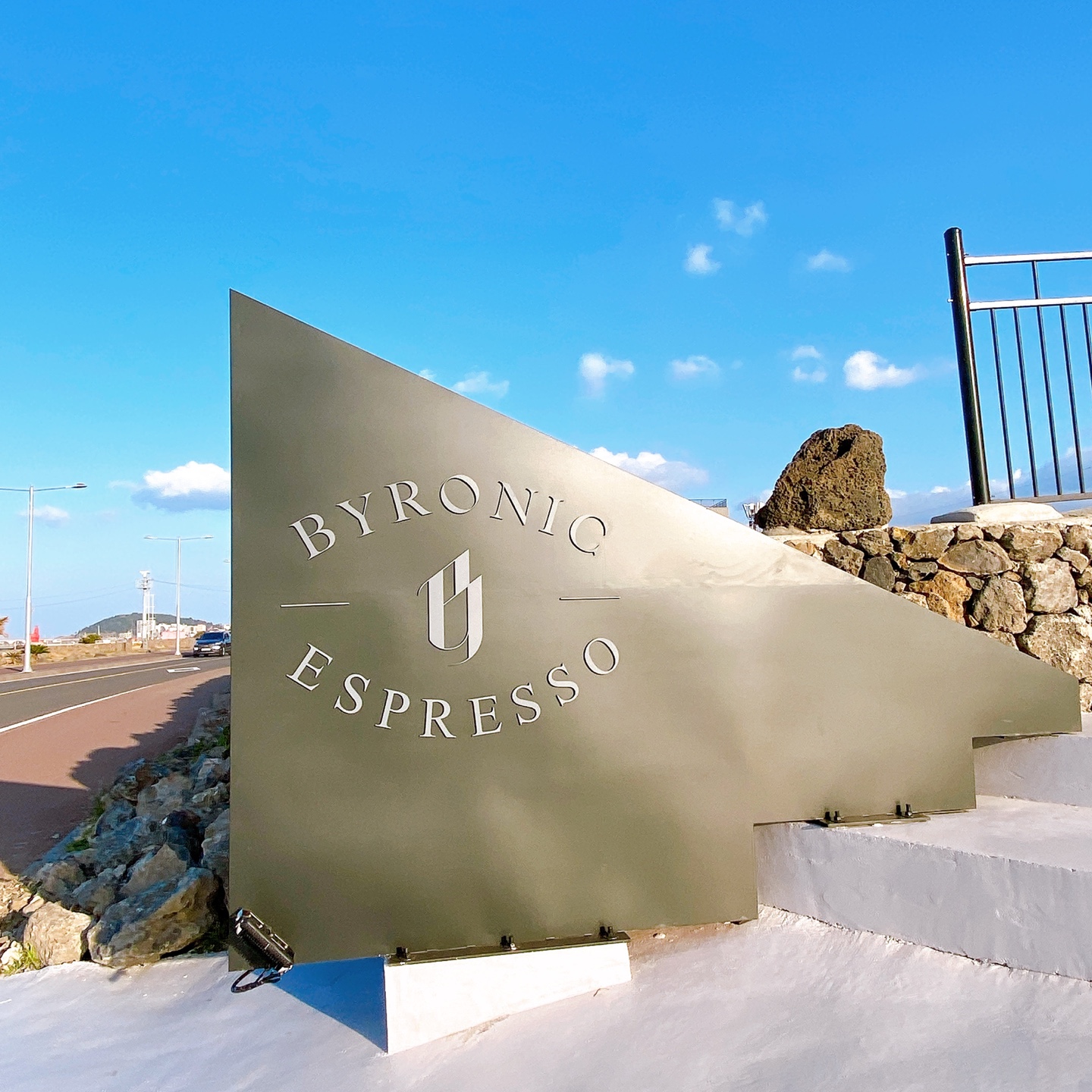 제주 알작지해변근처 오션뷰 바이러닉 에스프레소의 건물 2층에는 바이러닉에스프레소의 정체성을 담은 하얀 호리존이 포토존으로서 활용되고 있습니다. 카페 측의 캐스팅을 당하지 않더라도 포토존을 이용하여 개인적으로도 프로필 사진을 남길 수 가 있다는 것이죠.