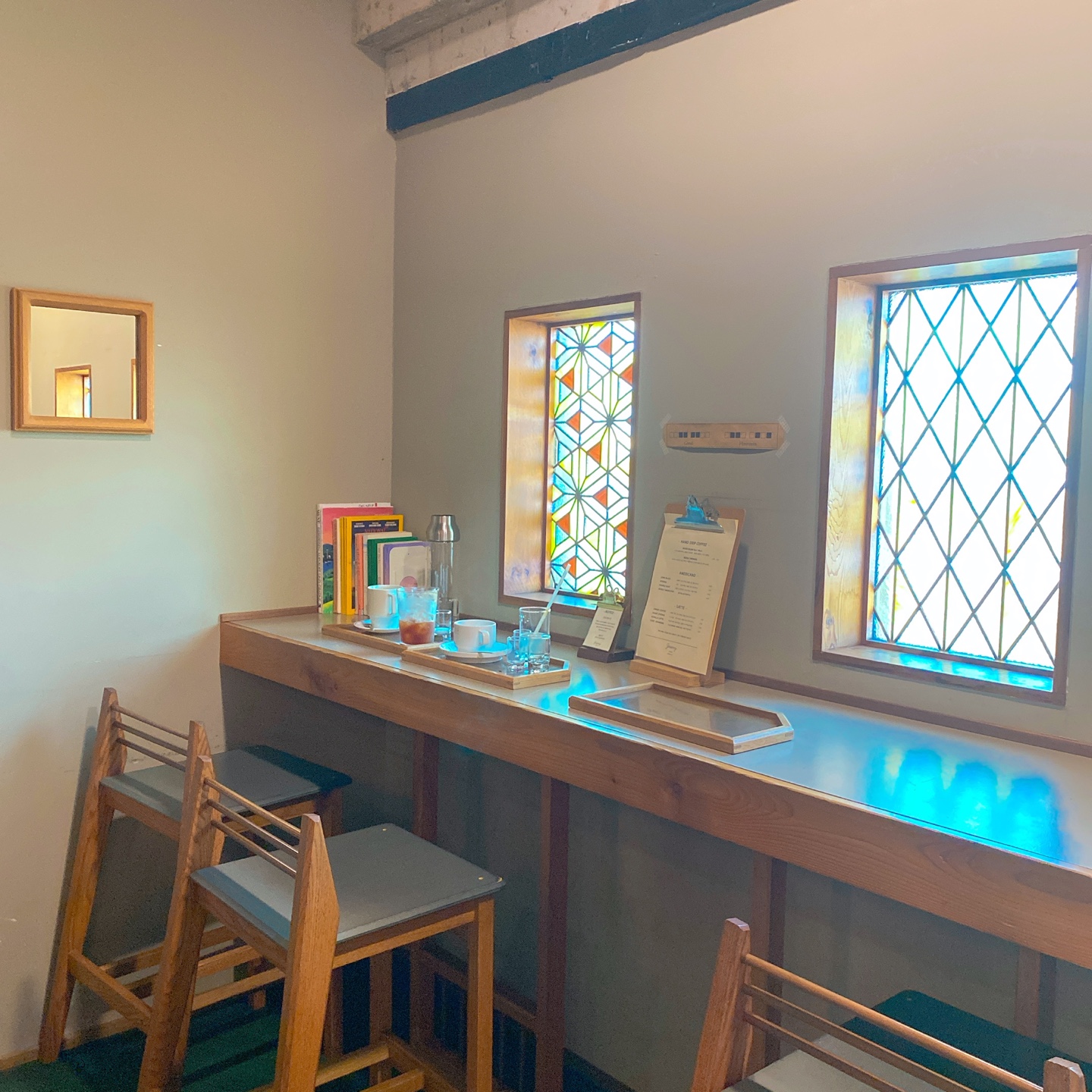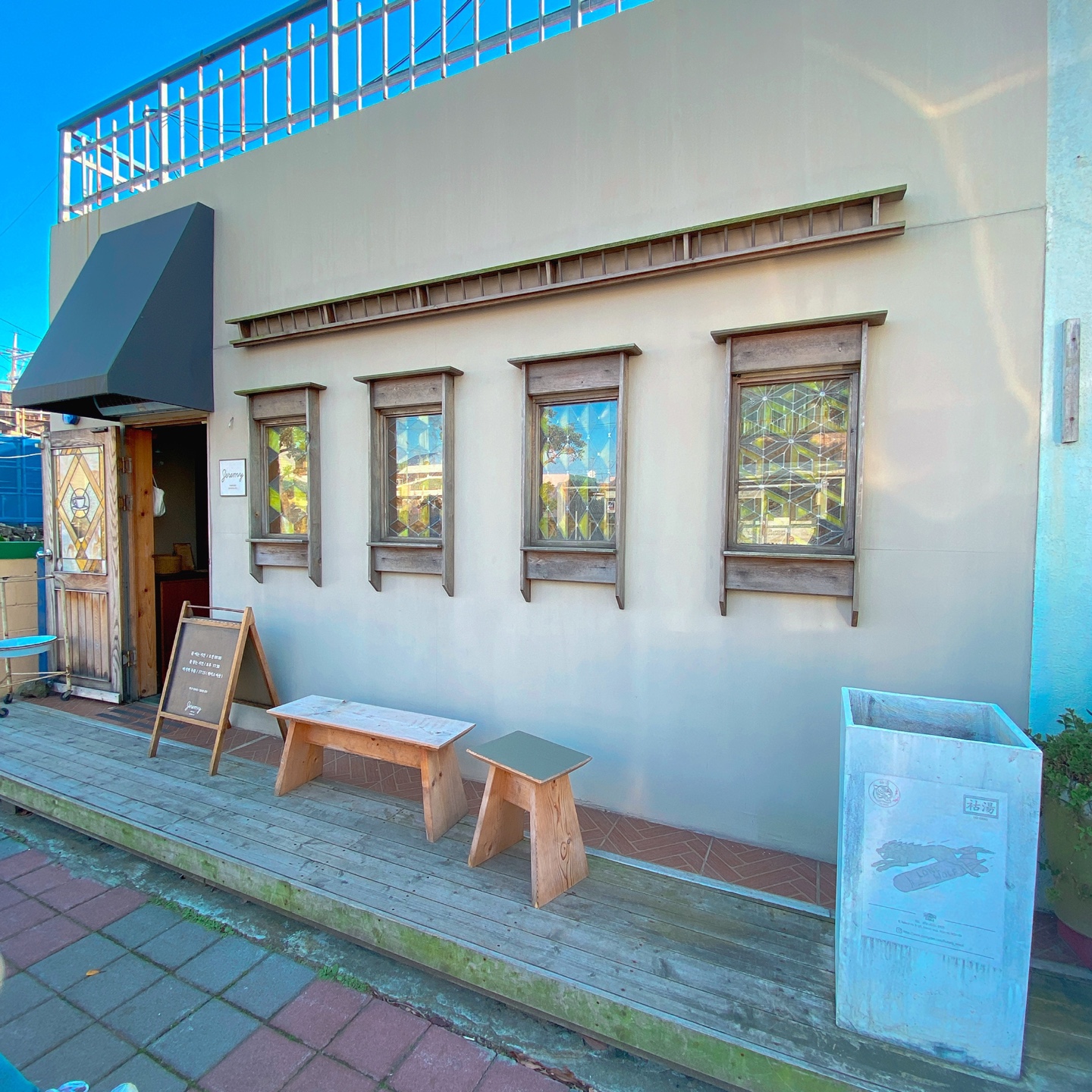 제주 애월 제레미카페의 테이블 규모는 10명이 남짓한 자리로 마련되어 있으며 그로인해 방문객들마다 자신만의 프라이빗한 공간으로 여유를 즐길 수 있다는 점입니다. 전체적으로 브라운톤의 원목 가구들을 배치하고 유리창에 브라운톤과 잘 어울리는 색상의 시트지를 붙여서 따뜻한 분위기를 조성하였습니다.