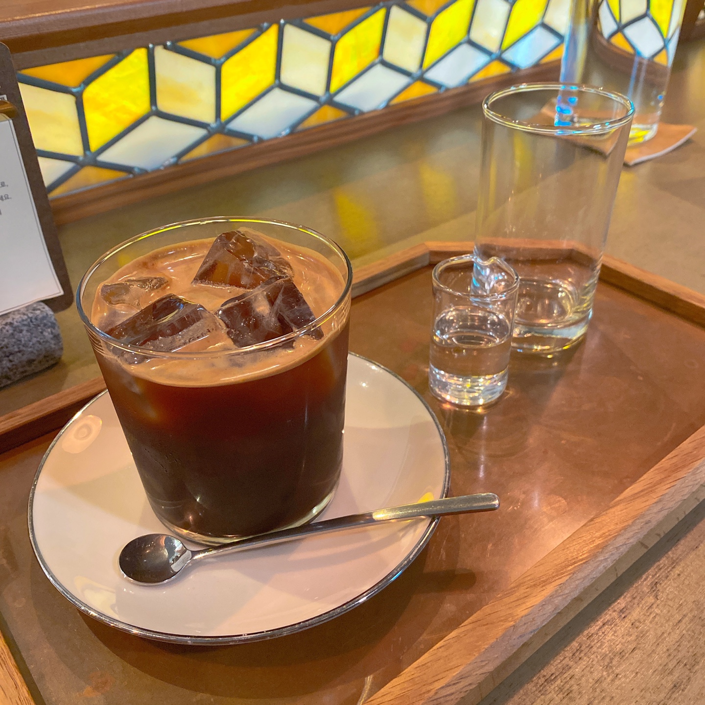 테이크아웃잔에 커피를 담아가는 것도 좋지만, 카페안에서 커피를 마시면 특별한 체험을 경험할 수 있습니다. 마치 호텔을 방문하 듯 우드트레이 위에 주문했던 커피 한잔과 물을 마실 수 있는 유리컵 그리고 그 커피에 어울리는 설탕과 시럽을 따로 내어주십니다.