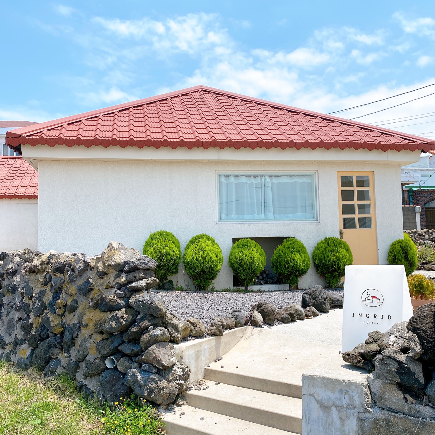 제주 바다색과 대비되는 빨간지붕이 눈에 띄는 아기자기하고 예쁜 카페가 바로 인그리드 카페입니다. 구멍이 송송 뚫린 제주 현무암 돌담을 넘으면 자그락거리는 자갈밭을 밟으면 작은 피크닉을 연상케하는 감성 야외 포토존을 만날 수 있습니다. 방문객이 많을 경우 줄을 서서 촬영을 해야하니 인생샷을 건지고자 하시는 분들이라면 가급적 일찍 방문하시는 것을 추천합니다.