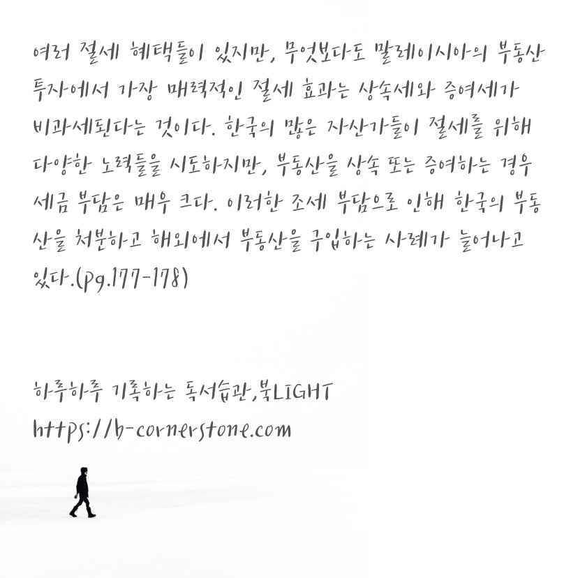 부동산을 거래하며 나타나는 투자금 중 우리는 결코 세금을 무시할 수 없습니다. 말레이시아도 세금이 전혀 없다고는 할 수 없지만 다른 국가들과 비교했을 때 비교적 저렴한 편입니다. 또한 부동산을 거래하며 드는 중개수수료나 변호사 수수료와 같은 거래비용도 한국, 싱가포르, 그리고 홍콩에 비교하면 매우 낮은 편이라고 합니다.